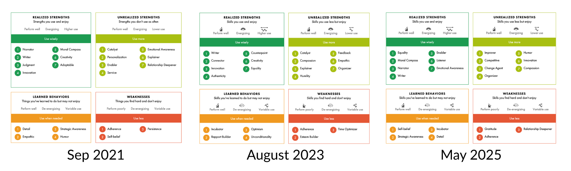 Reviewing my Strengths Profile snapshots from September 2021, August 2023, and May 2025, it's powerful to see just how much has evolved — and how much has become clearer.